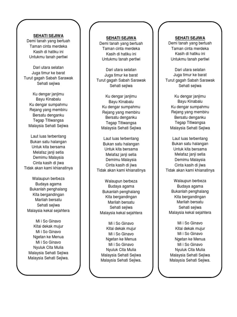 Lirik Lagu Sehati Sejiwa. Chorus Ku dengar janjimu Bayu Kinabalu Ku dengar sumpahmu Rejang yang membiru Bersatu denganku Tegap Titiwangsa Malaysia. Sehati Sejiwa Demi tanah yang bertuah Taman cinta merdeka Kasih di hatiku ini Untukmu tanah pertiwi Dari utara selatan Juga timur ke barat.